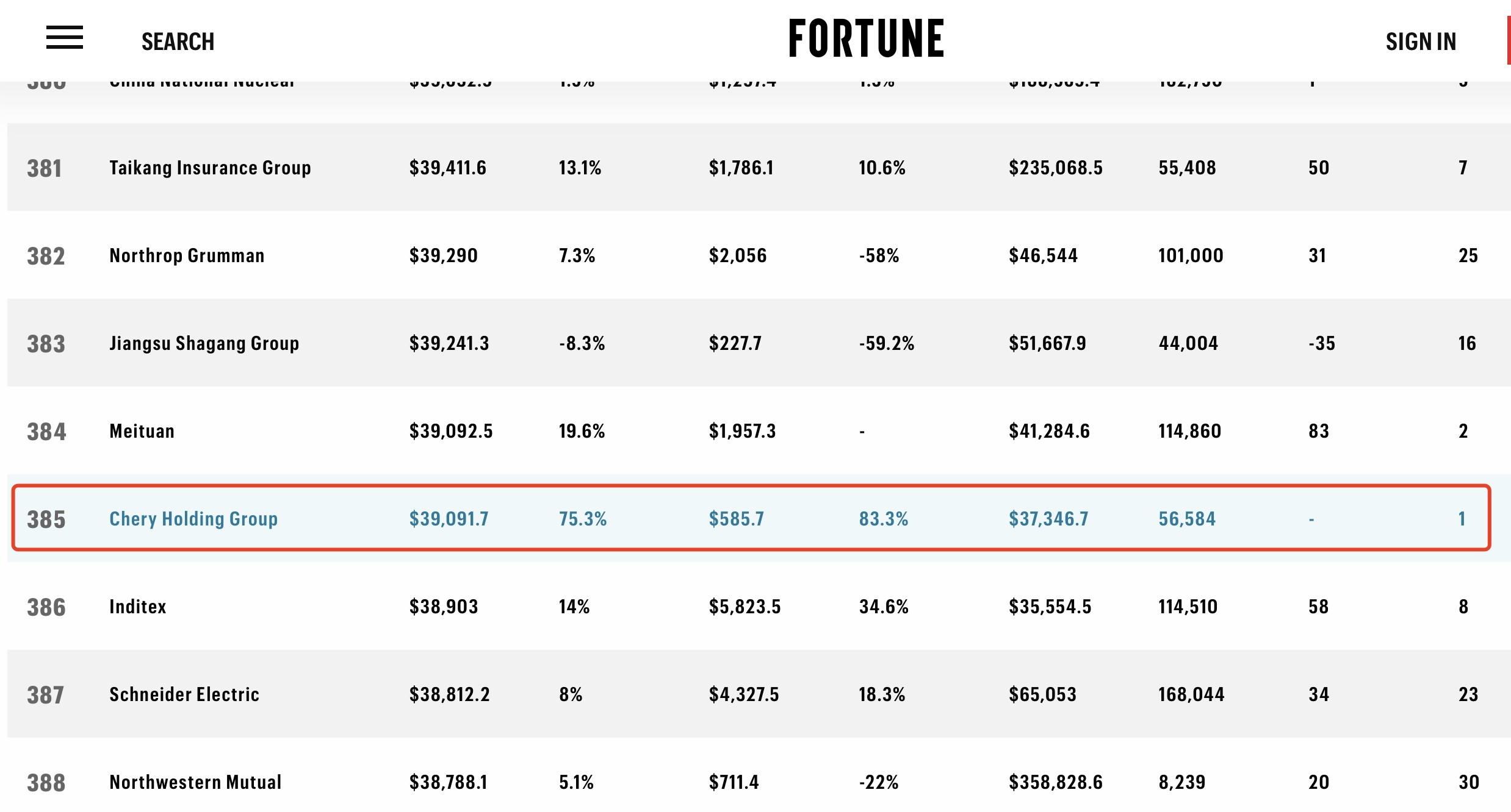 Dana 5. kolovoza, objavljena je Fortune Global 500 lista za 2024. godinu, a među najuspješnijim tvrtkama prvi se put našao i Chery, vodeći kineski nezavisni proizvođač automobila. Chery je zauzeo 385. mjesto s operativnim prihodom od 39,0917 milijardi američkih dolara, čime je dodatno potvrđena njegova globalna konkurentnost.